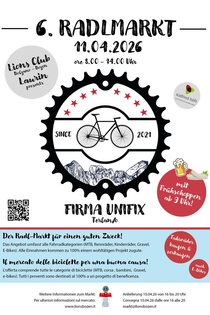 Der Lions Club Bozen organisiert am Samstag, 11. April, den beliebten Benefiz-Radlmarkt in Terlan. Veranstaltungsort ist das Gelände der Unifix.