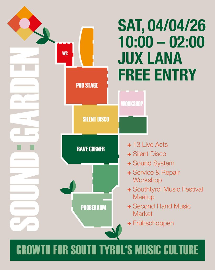 Ein Samstag voller Musik, guter Stimmung und abwechslungsreichem Programm: Im Jugendzentrum Jux in Lana steigt am 04. April der „Sound Garden“ – ein zentraler Treffpunkt für die Südtiroler Musikszene. Insgesamt 13 Live-Acts sorgen für ordentlich Stimmung – von Rock, Punk und Hip-Hop bis hin zu Trash Metal.